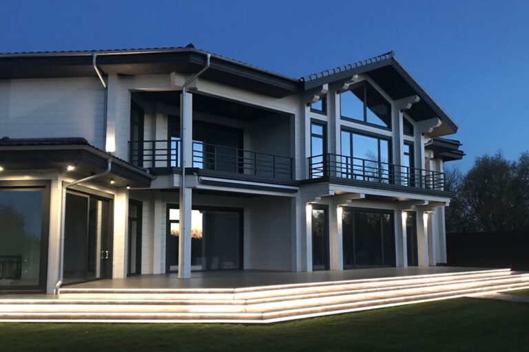 Masterline 8Hi-Aluminiumfenster und MasterPatio-Schiebetüren aus dem belgischen Reynaers-Aluminiumprofilsystem passen perfekt zum Charakter des Holzhauses. Das innovative Design der 8Hi-Fenster sorgt für eine wirksame Isolierung, während die MasterPatio-Schiebetüren Funktionalität mit Eleganz verbinden. Es ist eine harmonische Kombination aus belgischer Präzision und der Wärme von Naturholz und schafft eine langlebige und stilvolle Verglasung für Ihr Zuhause.